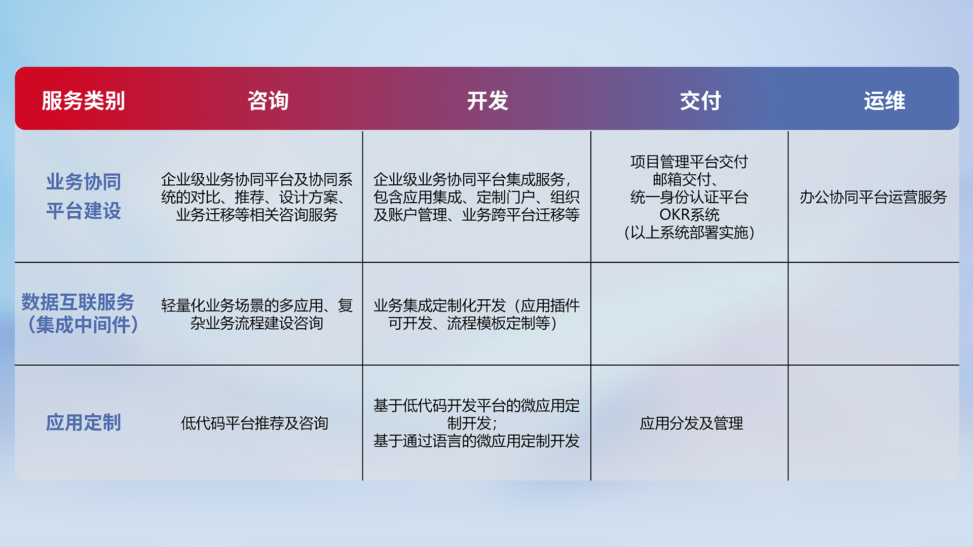 针对钉钉、、、、企微、、、、IDaas等平台级产品提供产品的规划、、、方案、、交付、、、定制化开发等服务,,,实现如统一协同办公、、、、智能客户服务、、、、混合会议管理、、、智能数据查询、、、等业务场景,,实现数字化转型。。