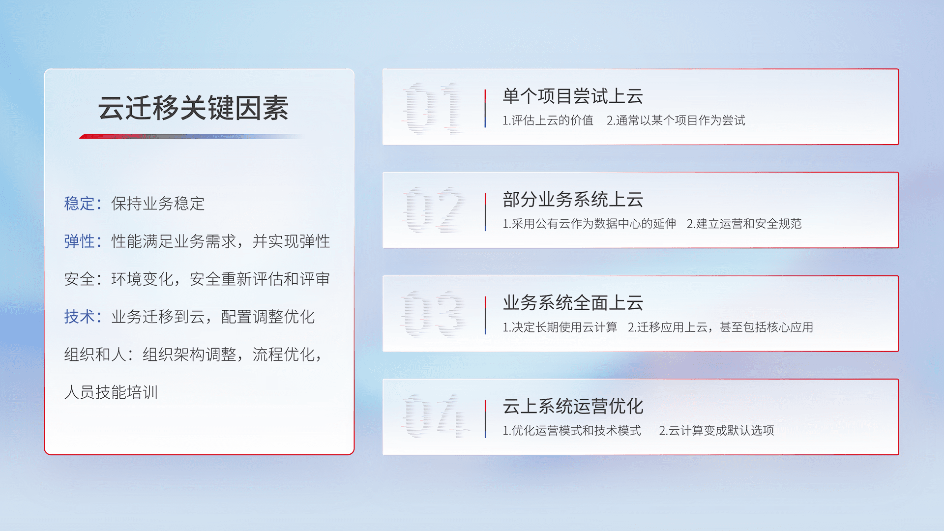 结合实际业务,,,,从规划设计、、云平台选型、、云原生改造、、数据迁移、、、、集成交付,,,,迁移全过程为客户识别最佳上云路径,,,做好风险识别管理,,,设计网络架构、、、身份权限、、安全审计合规、、操作审计、、日志审计、、监控告警策略、、多站点容灾设计等,,对云上基础设施进行整体规划,,,,提升IT治理水平,,以满足弹性、、高可用、、高性能的需求。。。。