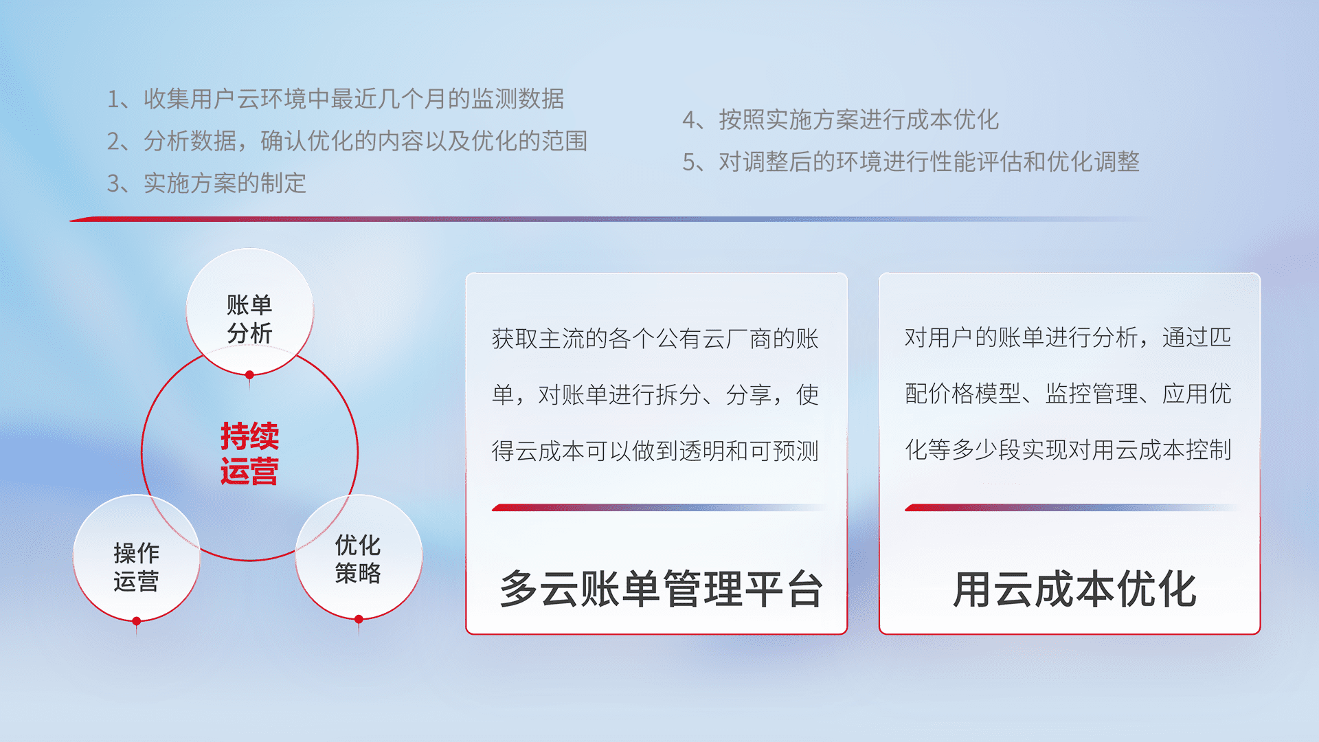 通过多云纳管,,,,以统一的资源数据模型把客户的云资源进行抽象和封装,,,,进而实现对多云资源的统一操作,,,保障云资源管理的可靠性、、、稳定性与可用性。。。。量身定制化运维内容,,,,配置、、、、开发运维、、补丁管理、、、、备份、、、、监控、、、、认证和访问管理、、审计和日常巡检等,,,保障在用云过程中的可靠度,,,,稳定度以及高可用率。。